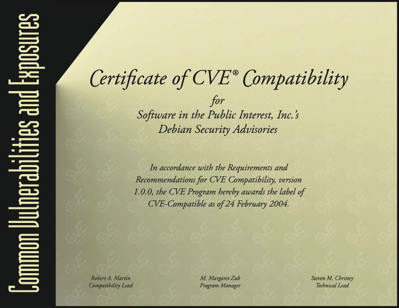 Debian estime que fournir aux utilisateurs des informations supplémentaires liées aux problèmes de sécurité qui touchent la distribution Debian est extrêmement important. L'inclusion des noms CVE dans les alertes aide les utilisateurs à associer des failles génériques avec les mises à jour spécifiques de Debian, ce qui réduit le temps passé à gérer les failles qui concernent nos utilisateurs. Cela facilite également la gestion du risque dans un environnement où sont déployés des outils de sécurité gérant CVE — comme des systèmes de détection d'intrusion d'hôte ou de réseau ou des outils de vérification de failles — qu'ils soient ou non basés sur la distribution Debian.